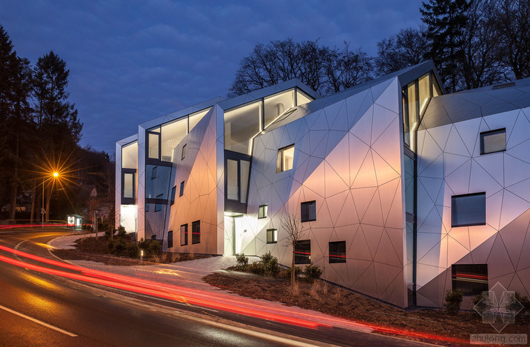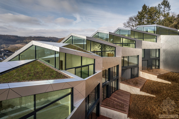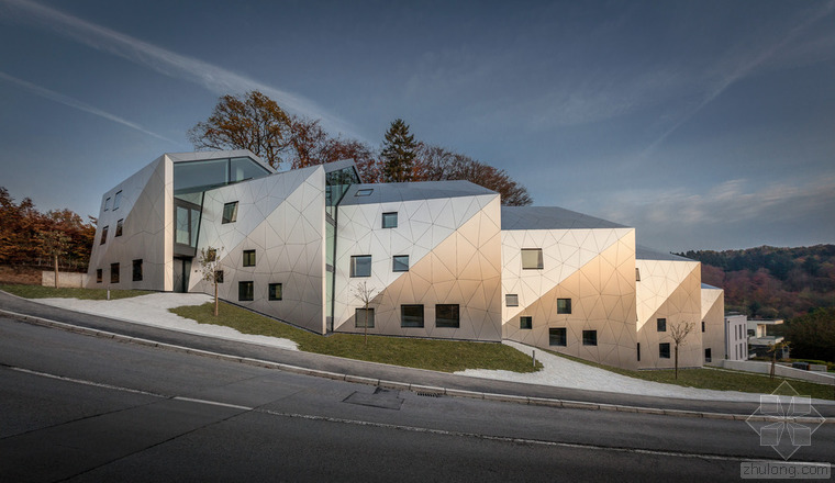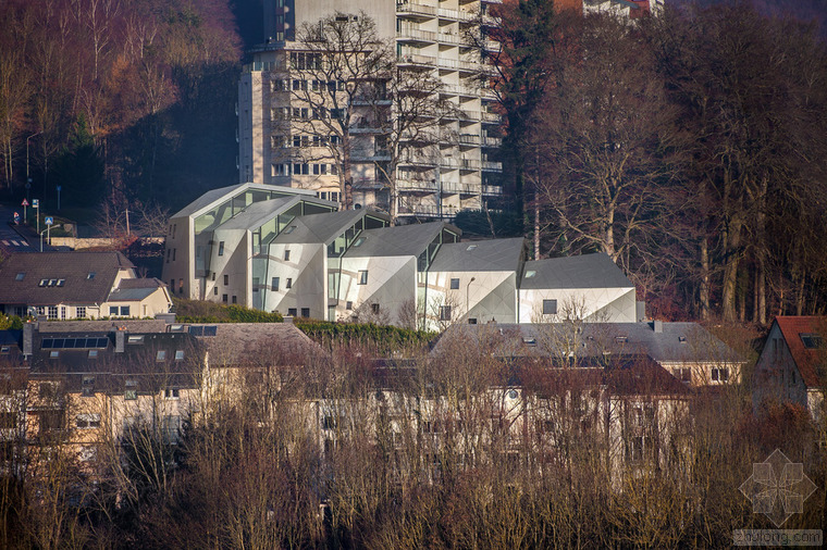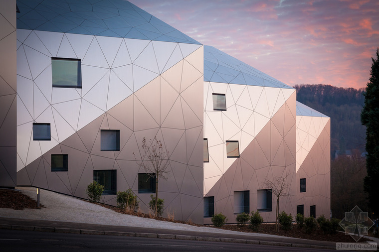 根據(jù)城市建筑規(guī)章條例規(guī)范,無論地形有多奇怪,都可以建造簡易的兩層單體建筑,并且?guī)в械叵率?。但是,周圍的環(huán)境、特殊的地形條件和基地的形式造就了各種各樣的建筑,與此同時也產(chǎn)生了上文所指出的問題。基地位于一條十分彎曲的街道邊緣;地形高差達10米,非常陡峭;基地上保留有樹齡300年的古樹,且被列為國家歷史文物。所有的這些狀況使建筑有了最初的形狀。此外,該建筑還呼應(yīng)了特殊的城市環(huán)境(一邊是小體量的住宅單元,而另一邊是大體量的公寓樓。)建筑師通過將主體分成六個小的、垂直位移的體塊,創(chuàng)造了一個巧妙地轉(zhuǎn)變。建筑通過這種方法適應(yīng)了環(huán)境,既保持了所需的密度,又賦予其歸屬感、特性和人性化。體塊的分割和位移需要謹慎地研究自然采光的需求、朝向城市景觀的開闊視野,并且創(chuàng)造天地之間的視覺連接,同時還要保護住戶的隱私。