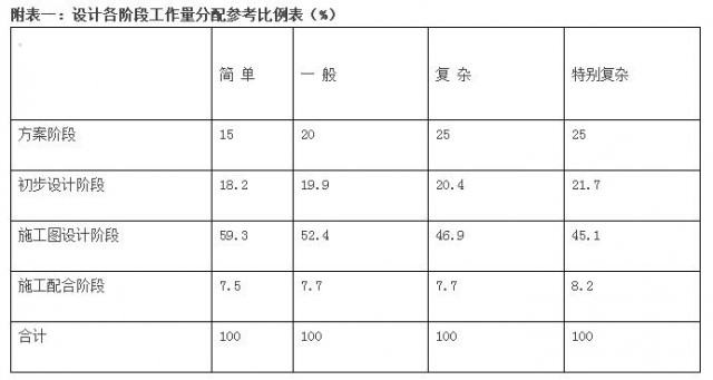 定額》(住房和城鄉(xiāng)建設部頒發(fā)),詳見附表一《設計各階段工作量分配參考比例表》。