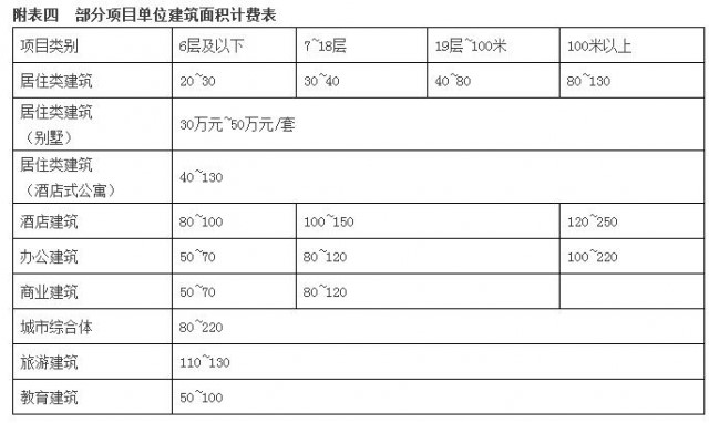 部分項目可采用單位建筑面積方式計費,詳見附表四《部分項目單位建筑面積計費表》