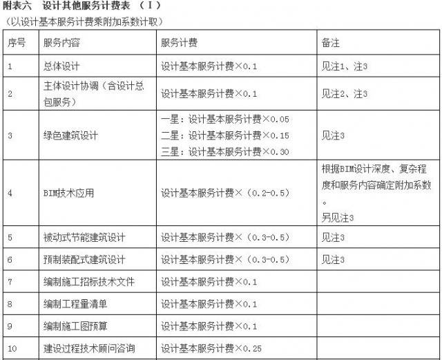 2.3 “設計其他服務”是指發(fā)包人要求設計人另行提供且發(fā)包人應當單獨支付費用的服務,包括:總體設計、主體設計協(xié)調(diào)(包括設計總包服務)、采用綠色建筑設計、應用BIM技術(shù)、采用被動式節(jié)能建筑設計、采用預制裝配式建筑設計、編制施工招標技術(shù)文件、編制工程量清單、編制施工圖預算、建設過程技術(shù)顧問咨詢、編制竣工圖、駐場服務;提供概念性規(guī)劃方案設計、概念性建筑方案設計、建筑總平面布置或者小區(qū)規(guī)劃方案設計、綠色建筑設計標識評價咨詢服務;提供室內(nèi)裝修設計、建筑智能化系統(tǒng)設計、幕墻深化設計、特殊照明設計、鋼結(jié)構(gòu)深化設計、金屬屋面設計、風景園林景觀設計、特殊聲學設計、室外工程設計、地(水)源熱泵設計等服務。其服務計費為“設計其他服務計費”。