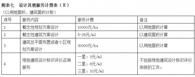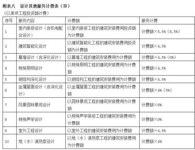 設計其他服務包括的內(nèi)容見第一章2.3條款所述,其計費詳見附表六《設計其他服務計費表(Ⅰ)》、附表七《設計其他服務計費表(Ⅱ)》及附表八《設計其他服務計費表(Ⅲ)》。第一章2.3條款未涉及的設計其他服務內(nèi)容的計費可比照附表六、七、八執(zhí)行。