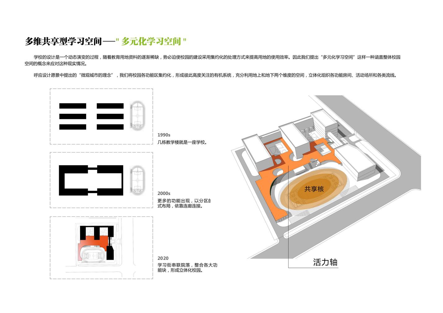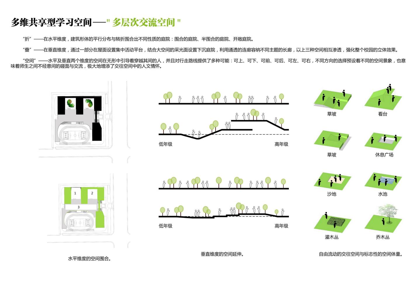 因本學(xué)校規(guī)模的班額較多,土地資源緊張,為了提高用地的使用效率,我們利用了地上以及地下的兩個(gè)空間,提出“雙首層”以及“雙地下”的概念,形成地上雙層以及地下雙層四個(gè)維度的空間,立體化的組織學(xué)校內(nèi)各功能房間,活動(dòng)場所以及各類流線。
