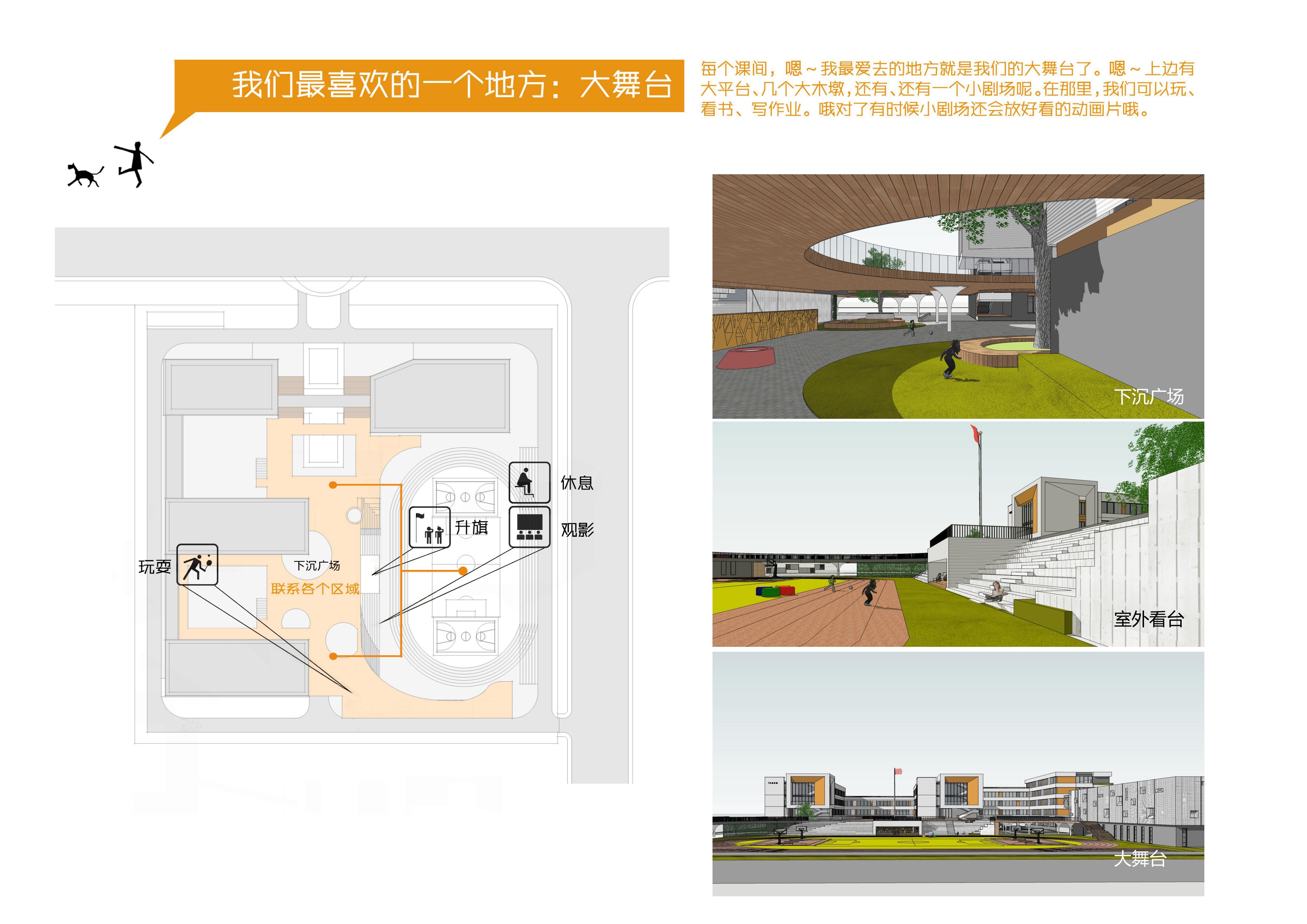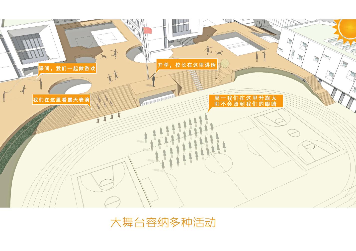“雙首層”概念是將學(xué)校地上中心部分,局部進(jìn)行一層架空懷抱住操場,架空平臺按照一半面積計(jì)算為1100平方,平臺上設(shè)置多個(gè)采光井,與景觀設(shè)計(jì)融為一體,形成學(xué)生的二層活動(dòng)空間,與教師增加更多學(xué)習(xí)交流的互動(dòng)空間,平臺下設(shè)置了功能房間,一個(gè)400平圖書閱覽室,2個(gè)音樂教室,1個(gè)舞蹈教室,一個(gè)體育器材室以及公廁。也形成了學(xué)生的一層活動(dòng)空間,這樣解決了學(xué)生多活動(dòng)場地少的難題,也解決了舞蹈音樂教室對普通教室教學(xué)引起的噪音污染問題。